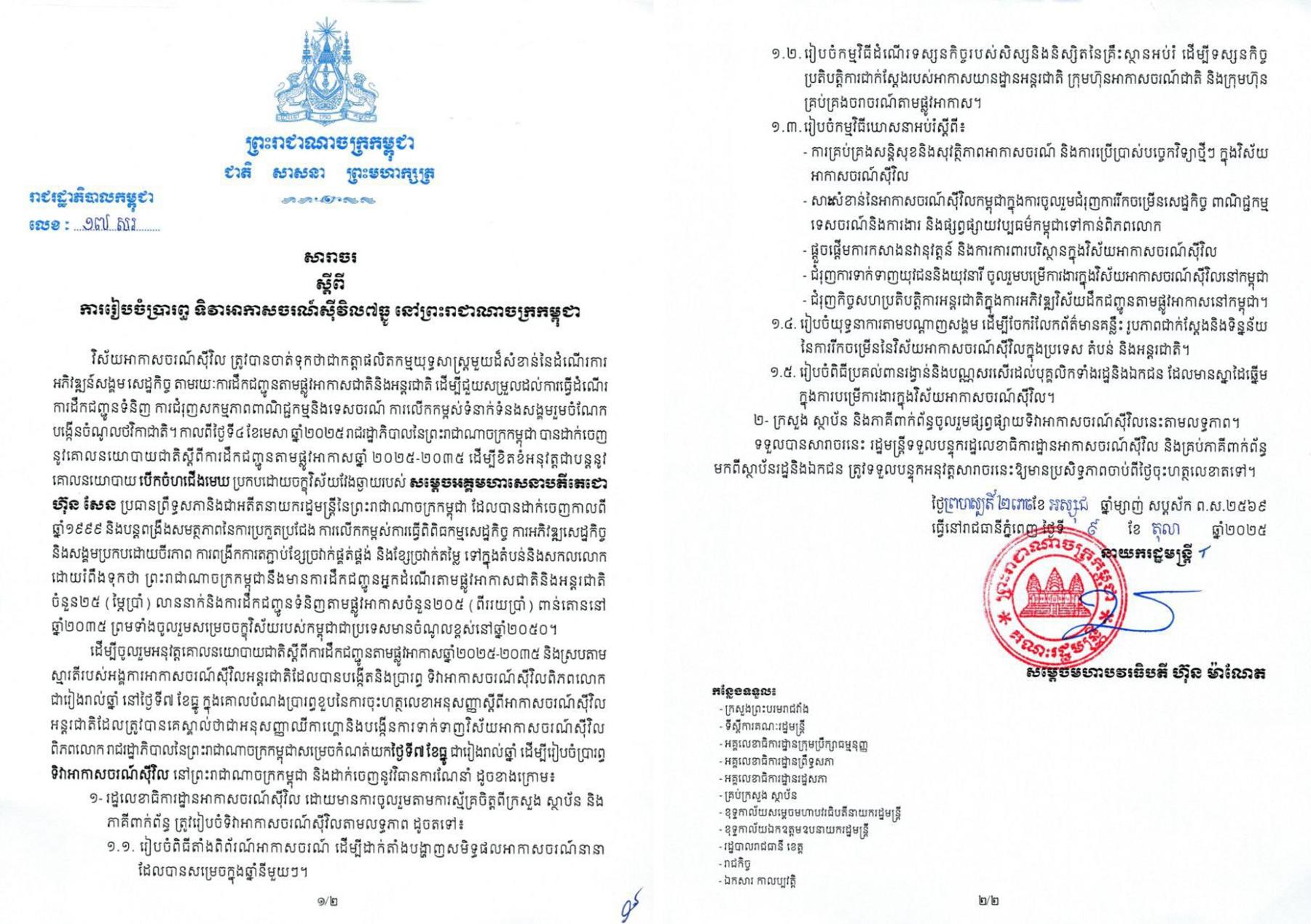 យោងតាមសារាចរ របស់រាជរដ្ឋាភិបាល លេខ: ១៧ សរ ចុះហត្ថលេខាដោយ សម្តេចធិបតី នាយករដ្ឋមន្ត្រីកម្ពុជា នៅថ្ងៃទី ៩តុលាឆ្នាំ២០២៥ បានសម្រេចអនុម័តយក ថ្ងៃទី ៧ធ្នូ ជារៀងរាល់ឆ្នាំ ដើម្បីរៀបចំប្រារព្ធ "ទិវាអាកាសចរណ៍ស៊ីវិល" នៅក្នុងព្រះរាជាណាចក្រកម្ពុជា ដើម្បីស្របតាមគោលនយោបាយជាតិស្តីពី ការដឹកជញ្ជូនតាមផ្លូវអាកាសឆ្នាំ ២០២៥-២០៣៥ និងដើម្បីបន្តការអនុវត្ត តាមគោលនយោបាយ បើកចំហរជើងមេឃ របស់សម្តេចតេជោ ប្រធានព្រឹទ្ធសភា និងជាអតីតនាយករដ្ឋមន្ត្រីកម្ពុជា។