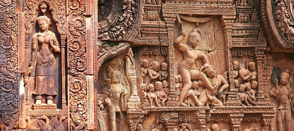 ប្រសិនបើលោកអ្នកបានទៅដល់ប្រាសាទបន្ទាយស្រី យើងនឹងបានឃើញនូវចម្លាក់លើប្រាង្គប្រាសាទទាក់ទងនឹងលទ្ធិទេវរាជ រឿងរាមកេរ្តិ៍ ជាពិសេសគឺចម្លាក់ផ្កាភ្ញីយ៉ាងរស់រវើក និងចម្លាក់ទេពអប្សរាចំនួន ១៥០០ ដែលជាទេពអប្សរទាំងអស់សុទ្ធតែខុសៗគ្នា។