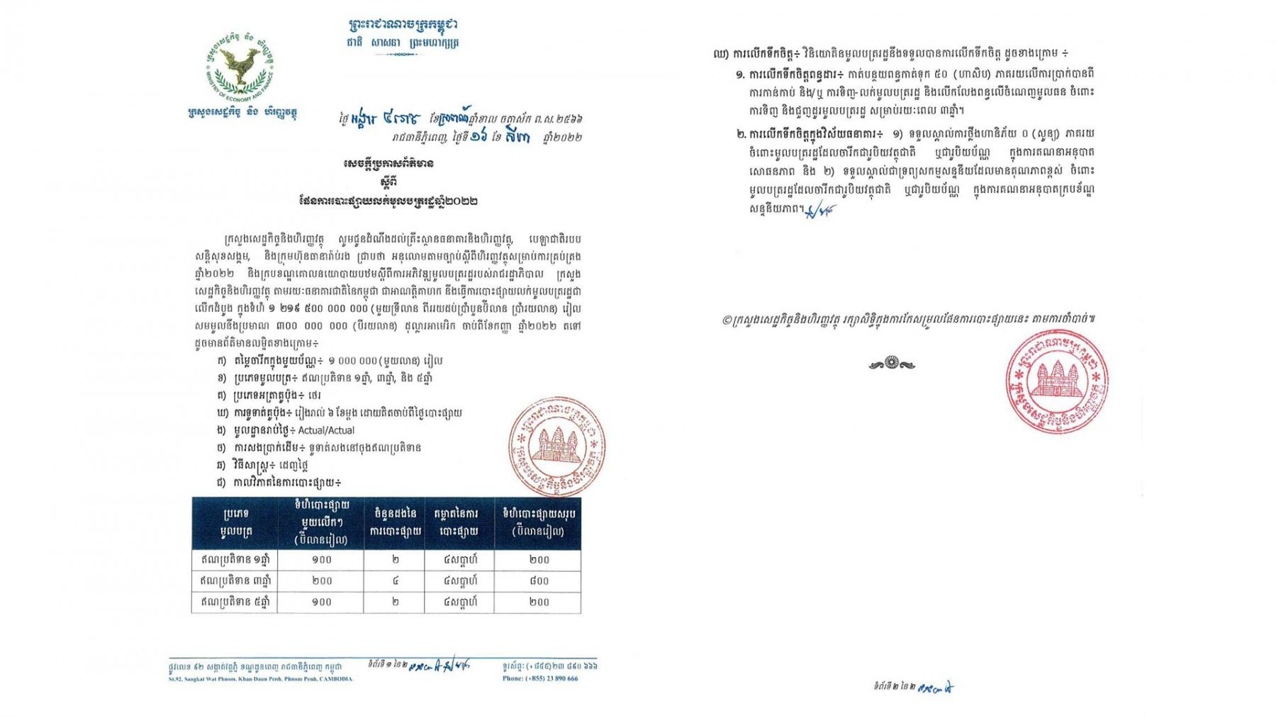 សេចក្តីប្រកាសព័ត៌មាន របស់ក្រសួងសេដ្ឋកិច្ច និងហិរញ្ញវត្ថុ ចុះកាលបរិច្ឆេទថ្ងៃទី ១៦ ខែសីហា ឆ្នាំ ២០២២ ដែលត្រូវបានផ្សព្វផ្សាយ នៅថ្ងៃទី ២៥ ខែសីហានេះ បានឱ្យដឹងថា ការបោះផ្សាយលក់មូលបត្ររដ្ឋ ជាលើកដំបូងនេះ នឹងអនុវត្តចាប់ពីខែកញ្ញា ឆ្នាំ២០២២ តទៅ ដោយក្នុងមួយប័ណ្ណ មានតម្លៃ ១លានរៀល និងជាប្រភេទមូលបត្រ ឥណប្រតិទាន ១ឆ្នាំ, ៣ឆ្នាំ, និង ៥ឆ្នាំ។ មូលបត្រឥណប្រតិទាន១ឆ្នាំ មានទំហំបោះផ្សាយតម្លៃ ២០០ប៊ីលានរៀល ខណៈឥណប្រតិទាន ៣ឆ្នាំ មានទំហំបោះផ្សាយ ៨០០ប៊ីលានរៀល និងឥណប្រតិទាន៥ឆ្នាំ មានទំហំបោះផ្សាយតម្លៃ ២០០ ប៊ីលានរៀល។ សូមបញ្ជាក់ថា មូលបត្ររដ្ឋ គឺជាឧបករណ៍ហិរញ្ញវត្ថុ ដែលបង្កើតឡើងបម្រើ ដល់ការកៀរគរហិរញ្ញប្បទាន ទាំងក្នុងស្រុក និងក្រៅស្រុក ពីវិស័យឯកជន សម្រាប់អភិវឌ្ឍន៍សេដ្ឋកិច្ច និងសង្គម។