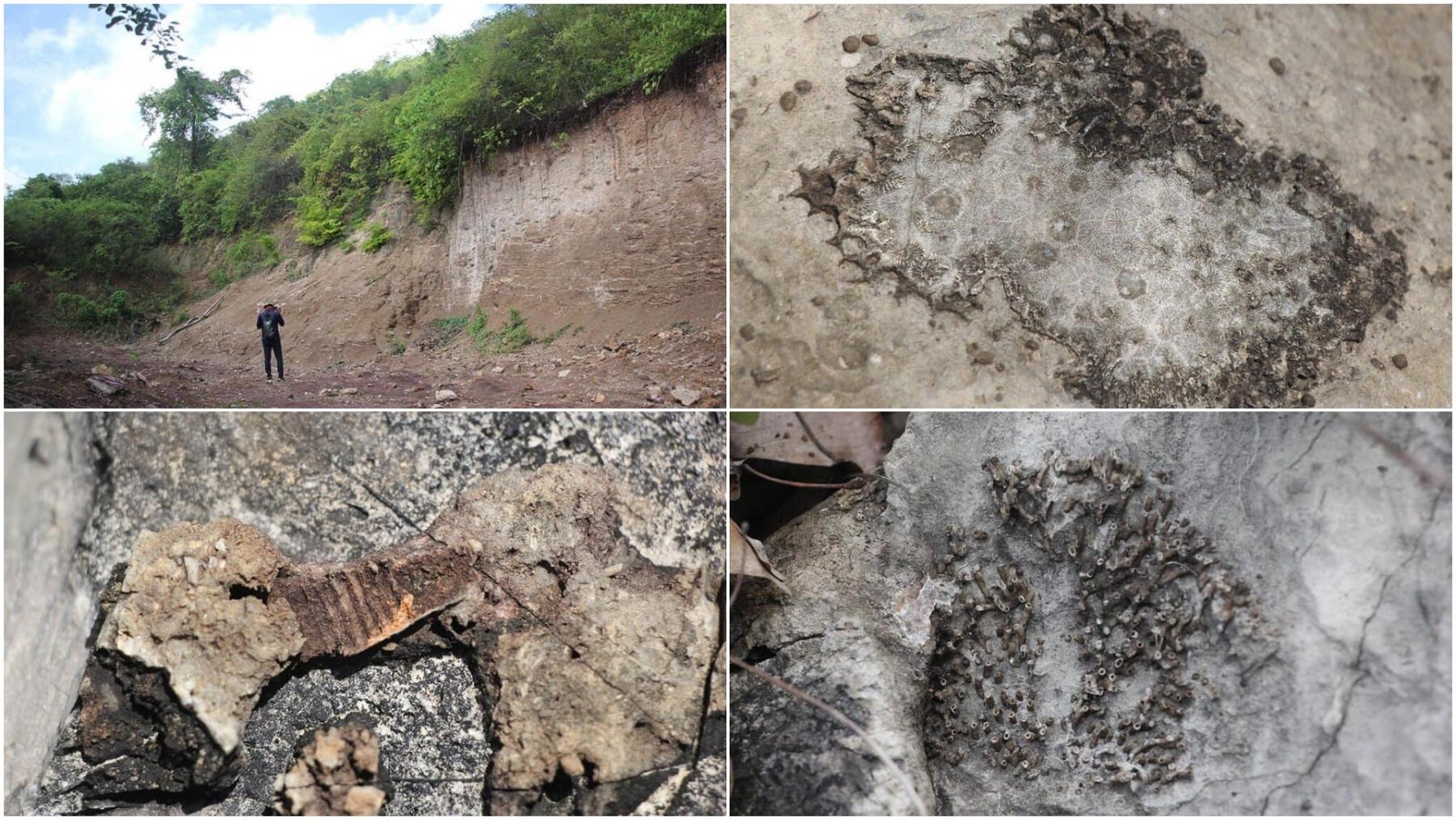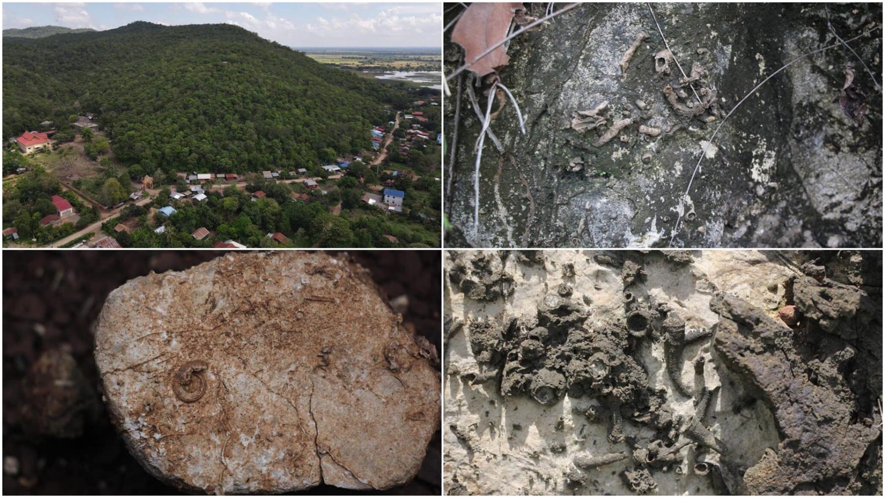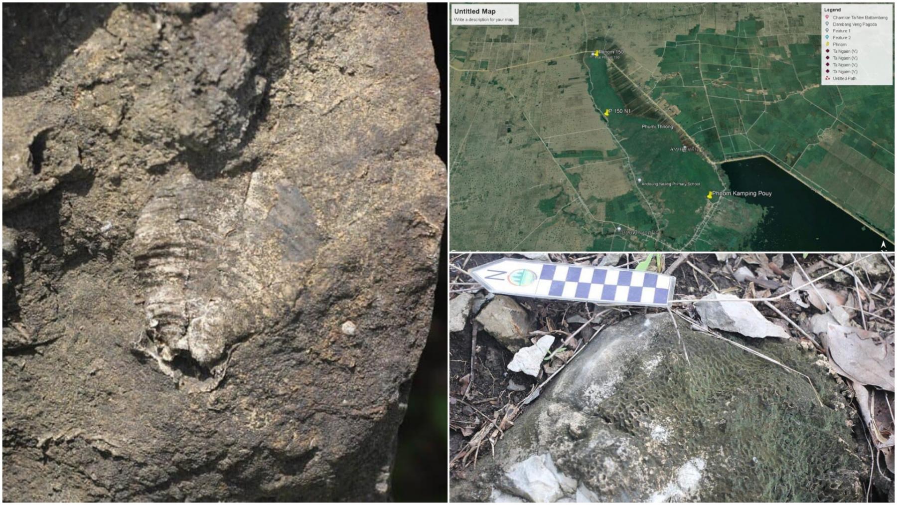 ក្នុងនោះក្រុមអ្នកជំនាញ បានកំណត់ទីតាំង ស្ថានីយផូស៊ីលសត្វសមុទ្រ នៅតំបន់ភ្នំ ១៥០ នៅខេត្តបាត់ដំបង។ នៅទីតាំងកាយយកអាចម៍ដីនេះ ក្រុមអ្នកស្រាវជ្រាវ បានប្រទះឃើញផូស៊ីលខ្យង ផូស៊ីលផ្កាថ្មសំបុកឃ្មុំ (រូបលេខ៥) នៅរាយប៉ាយ។ ចំណែកនៅទីតាំងមួយទៀត នៅវត្តភ្នំព្រះ ផូស៊ីលផ្កាថ្មសំបុកឃ្មុំ ដែលមានទំហំប្រមាណ ៥០ស.ម។ តាមរយៈផែនទីភូគព្ភសាស្ត្រ នៃព្រះរាជាណាចក្រកម្ពុជា បង្ហាញថាតំបន់ភ្នំមួយចំនួន ក្នុងខេត្តបាត់ដំបង គឺជាតំបន់ភ្នំមានថ្មកំបោរ ដែលមានអាយុកាល ស្ថិតនៅក្នុងសម័យកាល Permian (២៥១-២៩៩លានឆ្នាំ) ក្នុងស័ក Paleozoic៕