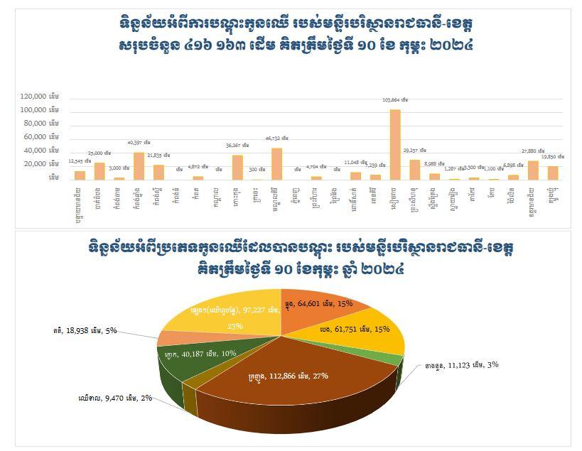 ភ្នំពេញ៖ បើយោងតាមរបាយការណ៍ព័ត៌មាន ចេញផ្សាយដោយក្រសួងបរិស្ថានបានឲ្យដឹងថា គិតមកត្រឹមថ្ងៃទី១០ ខែកុម្ភៈ ឆ្នាំ២០២៤ នេះ ក្រសួងបរិស្ថាន តាមរយៈ មន្រ្តីឧទ្យានុរក្ស នៃមន្ទីរបរិស្ថានរាជធានី និងខេត្តនានា បានបណ្តុះកូនឈើបានចំនួន ៤១៦ ១៦៣ដើម រួចជាស្រេច ដើម្បីឆ្ពោះទៅសម្រេចយុទ្ធនាការ ១០ តុលា ឆ្នាំ២០២៣ ស្តីពីការចែកជូនកូនឈើជាង ១លានដើមជារៀងរាល់ឆ្នាំ ជូនប្រជាពលរដ្ឋកម្ពុជា ដើម្បីដាំ និងស្តារព្រៃឈើឡើងវិញឱ្យបានជាង ៦០% នៅឆ្នាំ២០៥០។