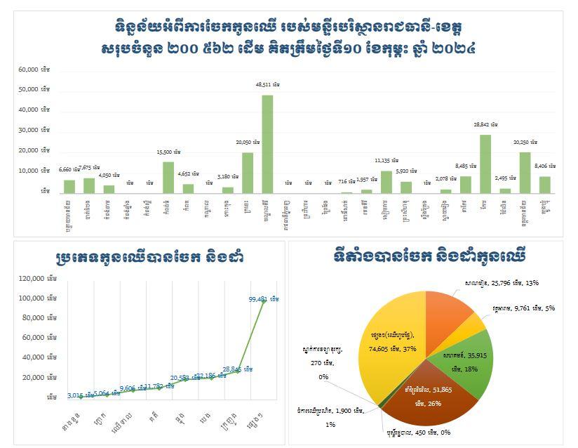 ជាក់ស្តែង បើគិតចាប់ផ្តើមពីថ្ងៃបើកយុទ្ធនាការ ១០ តុលា មកទល់ថ្ងៃទី១០ ខែកុម្ភៈ ឆ្នាំ២០២៤ នេះ មន្រ្តីក្រសួងបរិស្ថាន បានចែកកូនឈើគ្រប់ប្រភេទ (កូនឈើប្រណិត និងឈើហូបផ្លែ) ចំនួន ២០០ ៥៦២ដើម រួចជាស្រេច ទៅដល់ប្រជាពលរដ្ឋ ដើម្បីដាំស្តារព្រៃរិចរឹល ដាំនៅតាមមូលដ្ឋាន តាមសហគមន៍ ដាំនៅតាមសាលារៀន វត្តអារាមនានា។