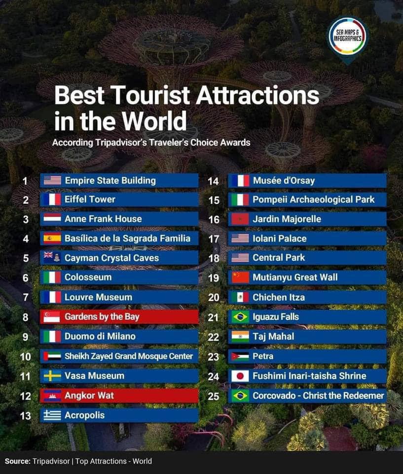 អន្តរជាតិ៖ បើយោងតាមលទ្ធផល នៃការស្ទង់មតិដែលចេញផ្សាយដោយ TripAdvisor កាលពីពេលថ្មីៗនេះ បានបង្ហាញពីតារាងនៃគោលដៅទាំង ២៥ ជាគោលដៅដែលមានទាក់ទាញ និងមានប្រជាប្រិយភាពបំផុត សម្រាប់ទេសចរណ៍ នៅលើពិភពលោក។