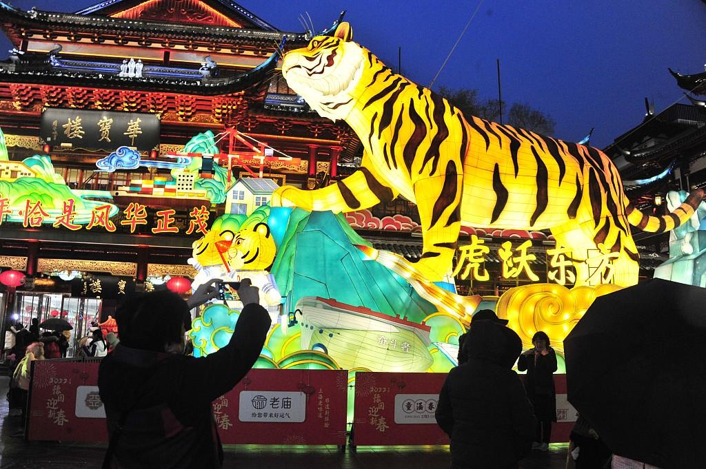 រូបខ្លា LED ដ៏ធំមួយត្រូវបានគេឃើញដាក់បង្ហាញនៅក្នុងសួន Yuyuan ដោយមានអ្នកទស្សនាថតរូប ដោយការដំឡើងនៅទីក្រុងសៀងហៃ ភាគខាងកើតប្រទេសចិន។